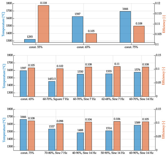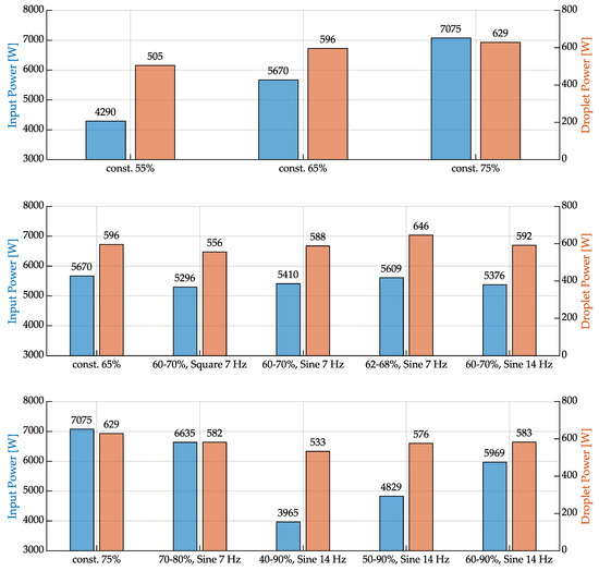 Figure 13 presents the power of the system recorded by the power meter in comparison to the measured droplet power. Figure 14 depicts the average droplet temperatures and the calculated efficiency of each experiment. The measurements from the experiments with constant generator power demonstrate that the device’s power consumption exhibits a nearly linear relationship with the set power. It becomes evident that when operating in pulse mode with oscillation around a mean value, the power intake is lower compared to operating at a constant power level equivalent to that mean value. This can be attributed to the generator’s characteristic of quickly dropping to a lower power level but slowly rising back to a higher level, as discussed earlier. Consequently, the power consumption in the pulse mode remains slightly lower than in the constant mode, regardless of the pulse frequency. If the base power is increased while reducing the pulse power to the same extent, thereby keeping the average power constant, the power consumption of the system still increases due to the described behavior.