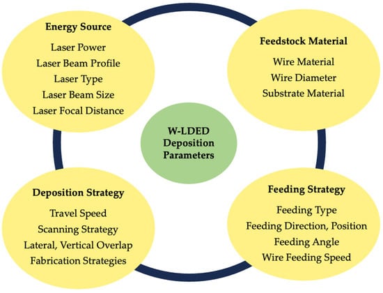 This work presents a review of the state-of-the-art in W-LDED to gain an in-depth understanding of the process variables and the cause–effect relationship affecting process stability. Additionally, the modeling and monitoring methods utilized in W-LDED literature are explored to enhance the quality of fabricated parts, thereby reducing the necessity for repetitive trial-and-error experiments, and minimizing material waste. The deposition parameters investigated in this work are sorted into four categories as depicted in Figure 1, where the impact of each variable on deposition quality, stability, and efficiency has been identified.