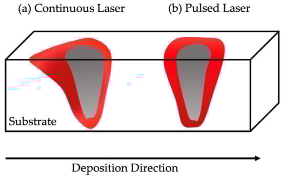 Research findings indicate that optimizing and customizing the laser type for specific materials can significantly enhance process efficiency and stability while offering economic benefits. There are two types of lasers, continuous, and pulsed. Investigations into the application of continuous and pulsed lasers have unveiled distinct behaviors in these laser types, particularly in terms of melt pool formation [65]. It is observed that when continuous lasers are used, the melt pool is dragged along the direction of deposition as the laser moves (Figure 2a), which may lead to intolerable heat accumulation over time [66,67]. In contrast, when utilizing the pulsed laser, the melt pool freezes between the pulses (Figure 2b), as documented by Assuncao et al. [68]. This is favorable as it reduces heat accumulation by carefully considering the pulse duration [68]. Studies have shown that longer pulse durations with a fixed power density increase penetration depth, signifying higher energy utilization [69]. Another advantage of pulsed lasers over continuous lasers is that pulsed laser allows for better heat input regulation over time during the deposition, as demonstrated by Ye et al.’s work [70].