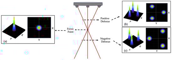 Schematic of a three-beam laser: (a) beams at the focal plane, (b) beams at positive defocus, and (c) beams at negative defocus (reproduced or adapted with permission from [100]: copyright 2021, Springer).