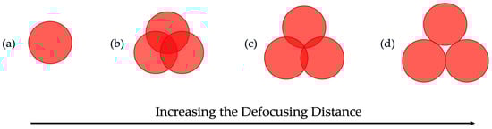 The evolution of the laser spot pattern with increasing defocusing offset is illustrated in Figure 5. It is evident that when the beams fully overlap, the energy has the highest intensity. However, increasing the defocusing distance slightly reduces the overlap and, consequently, the laser’s peak energy. If the beams do not overlap with each other and the wire (as shown in Figure 5d), the energy will not be sufficient to melt the wire.