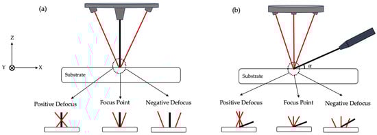 (a) Coaxial wire feeding and (b) lateral wire feeding at different defocusing distances.
