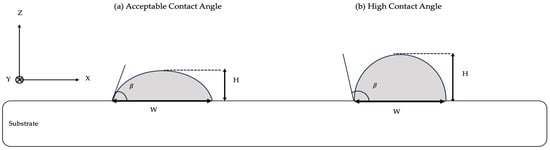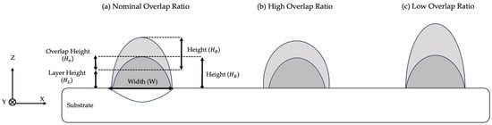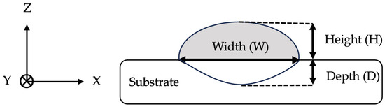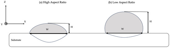 Aspect ratio has been widely utilized in the context of W-LDED to characterize the geometry of the bead at the cross-section by expressing the relation between the bead width and height as expressed in Equation (8) [47,58,138].