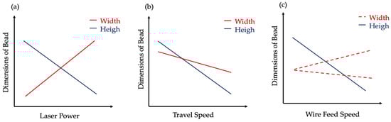 Schematic trend of bead width and height with increasing (a) laser power, (b) TS, and (c) WFS. The dotted line provided for (c) indicates the deviation observed in the literature.
