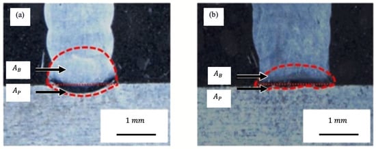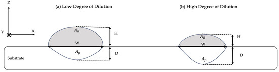 As demonstrated in Equation (7), dilution is calculated based on the ratio of the penetration area into the base material (i.e., ) to the total area of deposited material (i.e., + ) in the cross-section of the bead [34,54,134].