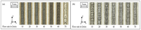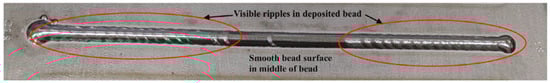 Process parameters affect bead geometry as they directly influence the thermal cycle under which the material is deposited and solidified during the process. These parameters, such as laser power, WFS, TS, and focal position, control the amount of heat input, cooling rate, and material flow dynamics [10,129]. Variations in these parameters lead to changes in the deposited bead’s shape and size (Figure 10). Therefore, careful control of process parameters is crucial to achieve a desirable bead geometry and quality, and to preserve the integrity of the deposition [130].