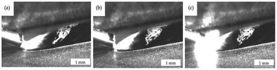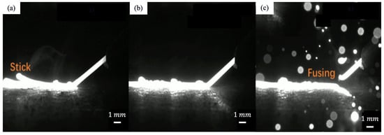 In the front feeding scenario, a continuous melting of the wire is observed, which is induced by laser irradiation, metallic vapor radiation, and melt pool radiation [17], creating a high-temperature melt pool (Figure 7) [113,114]. Syed et al. suggested that this leads to a favorable flow characteristic of the molten metal in the melt pool and results in a low surface roughness [115].