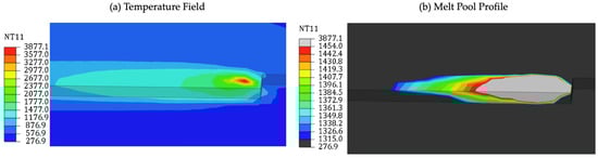 The Gaussian heat source exhibits a bell-shaped intensity profile (Figure 3d), with peak intensity at the center. As shown in Figure 3f, annular heat sources present a ring-like configuration, accurately distributing heat in a circular and well-defined shape, thereby enhancing process symmetry compared to Gaussian beam, owing to the annular beam’s lower intensity [78,79,80,81,82]. Froend et al.’s thermal analysis confirmed that, in contrast to an annular beam, the Gaussian beam’s intensity distribution and high irradiance lead to the formation of higher-temperature melt pools [83]. Chen et al.’s investigation reveals that annular beams require less laser power to melt the same amount of fed wire compared to the Gaussian distribution. This is particularly beneficial due to their lower peak energy density and more uniform energy distribution, providing a lower thermal gradient in the molt pool [84,85]. Goffin et al. compared a pedestal beam with a Gaussian beam to investigate the effect each has on melt pool formation and found that a pedestal beam heats the substrate more efficiently compared to a Gaussian beam with the same width. This is because the flat beam can directly heat the substrate, bypassing the need for heat conduction through the wire. This allows the substrate to achieve high temperatures with lower laser power levels [86,87,88].