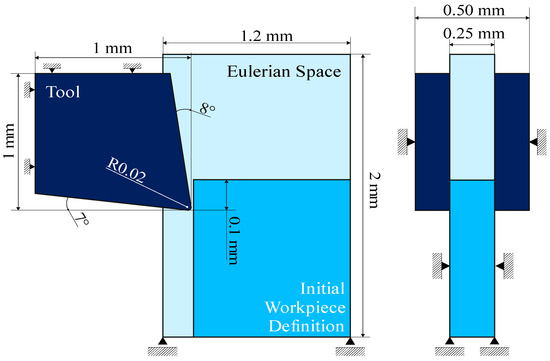 Since 2D simulations cannot be modeled with the CEL approach in Abaqus [28], the widely adopted quasi-2D approach was utilized, as shown in Figure 1. In this approach, 2D orthogonal cutting conditions were enforced through rigid clamping conditions perpendicular to the cutting plane. Through the definition of a workpiece geometry in the Eulerian mesh, the initial Eulerian volume fraction could be defined. However, it should be noted that the CEL approach is known to be computationally expensive, which is partly rooted in its advection processes, where the material flow in the mesh is corrected per iteration. The structure of the model can be seen in Figure 2.