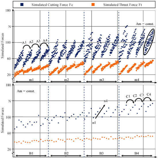 The cutting and thrust forces were assumed to be proportional to the maximum of the flow stress, since the chip height and width were fixed across all simulations. This trend was noticeable when taking into account the maximum and the minimum of the thrust force for each of the four values of parameter A. Since the value of parameter A affects the first term of the flow stress linearly, the influence of this parameter was noticeable. The encircled region in Figure 3 represents a parameter combination where m and A equaled 1.9404 and 1108.4 MPa, respectively. To better show the impact of changing parameters C and n on the forces, this region was zoomed in in the lower part of Figure 4. Here, except for the minimum B, a trend could be seen regarding the impact of a larger C value. However, the impact of changing the value of n by the same factor was greater according to the DOE mentioned above.