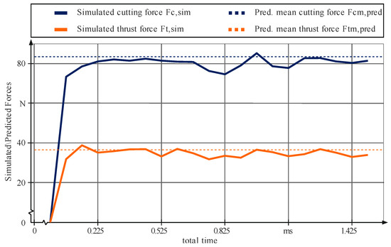 Comparison between simulated and predicted cutting and thrust forces for a parameter set outside the training and test datasets for Ti6Al4V.