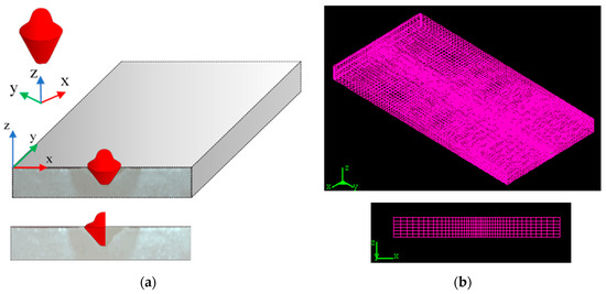 A three-dimensional conical Gaussian heat source, presented in Figure 2, was applied to simulate the welding thermal cycle during a bead-on-plate welding pass as indicated in Figure 3a. The parameters of this heat source are shown in Table 3, where Q0 is the heat density, ri, and re are the radius of the heat source at the position zi and ze, respectively, and Qeff is the effective power. For more details about this heat source, please refer to reference [30]. The material’s mechanical properties at room temperature for base material (BM) and filler wire (FW) are presented in Table 4. The dimensions in the simulation model were the same as those of the experimental plates. The geometric model of the welded plate was meshed. A fine mesh was used in the fusion zone and its adjacent, as shown in Figure 3b. The irregular mesh size was chosen following a peak temperature sensitivity analysis with an exactitude of around a 1.7% difference in the peak temperatures. The initial temperature of the plate is 20 °C. The exterior surface of the plate is applied with natural convection as a boundary condition with the convection heat transfer coefficient of 25 W/(m2·K). The temperature of the room is also 20 °C.