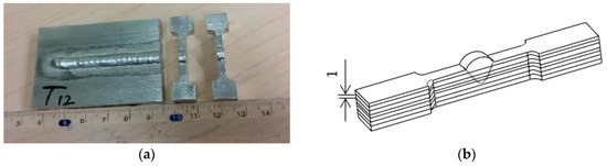 Micro-flat-tensile (MFT) specimens were extracted from welded samples and used in this investigation. A schematic diagram of the traction samples is shown in Figure 4. First, dog-bone sub-size traction samples were extracted from the welded sample normal to the welding line direction using a CNC machine as presented in Figure 4a. Figure 4b shows the cutting arrangement for the machined samples. A 24 mm gauge length was selected to cover different zones in the sample, such as the BM, HAZ, PMZ, and FZ, as shown in Figure 4c,d. The extracted samples were approximately 1 mm thick (±0.02), and care was taken to avoid any deformation or sequencing errors.