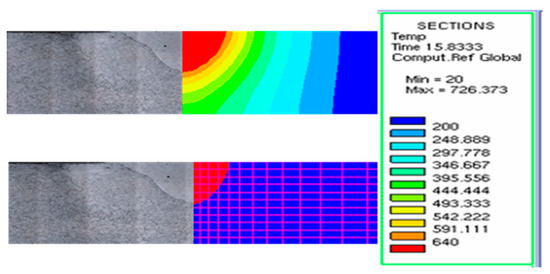 Figure 5 shows the temperature distribution and melting zone calculated by finite element analysis (FEA) using Sysweld (right side) and compared with the experimental results (left side). From the experimental and FEA thermal profile distribution, zones can be classified as base material, heat-affected zone, and fusion zone. It is clear that the melted zone calculated by FEA matches the experimental melting zone size, with slight differences resulting from the addition of filler.