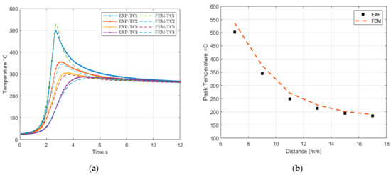 Thermal profile: (a) comparison between experiments and finite element simulation at points at different distances from the welding center line; (b) peak temperature comparison.