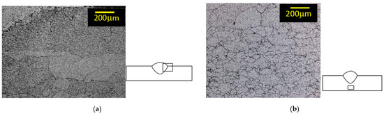 Figure 9a shows grains in the HAZ adjacent to the FZ, where the average grain size is around 318 µm. It was also observed that the grain size beneath the fusion zone decreases gradually as a function of distance from the welding line, as depicted in Figure 9b. Grain growth has a proportional relationship with peak temperature in terms of exposure time. However, its effect on mechanical properties compared with the effect of precipitation transformation is not significant [32,33], as can be observed by comparing the grain size with the lowest hardness in HAZ, which will be discussed in more detail in the next section.