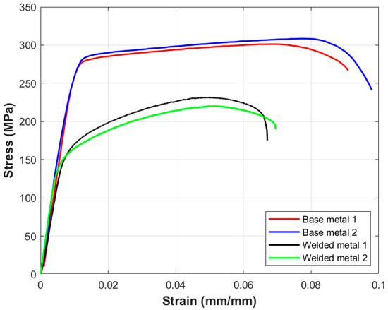Figure 11 and Table 6 present a comparison of our experimental results of the stress–strain curves as the mechanical behavior of the base metal and welded specimens.