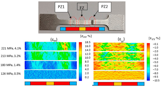 Strain measurements were captured at four stages (in elastic and plastic) of loading by DIC, and the results are illustrated for both directions in Figure 12. The stages correspond to the principal stress level in the x-direction and the mean strain values. It is noted that the strain was initially evenly distributed across the gauge length (FZ and HAZ) until the stress reached 126 MPa, as shown in Figure 12.
