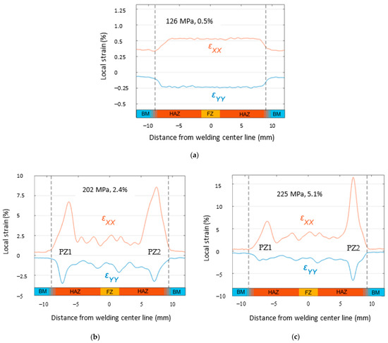 Average value of ԑXX and ԑYY in transverse weld direction for three stress/strain stages: (a) 126 MPa_0.5%; (b) 202 MPa_2.4%; and (c) 225 MPa_5.1%, illustrating local in-plane strain localization.