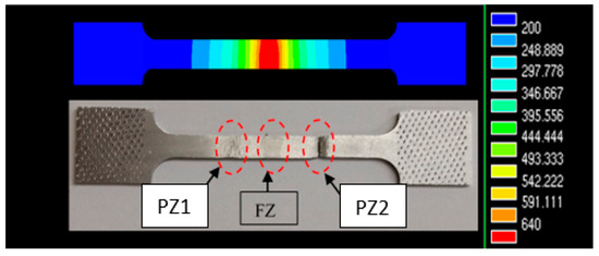 Figure 17 shows the welding thermal cycle distribution across the gauge length of the specimens extracted for the DIC. In the HAZ subzone adjacent to the FZ boundary, as explained in [34,35,36], where the peak temperature was between approximately 400 °C and 640 °C, the precipitate dissolved, resulting in the supersaturated solid solution (SSS), and because of the high cooling rate in this zone, which averaged −26 °C/s, the formation of re-precipitation during the cooling process was suppressed. In this zone, the increase in tensile properties could be attributed to the natural aging that occurs after cooling. The width of this subzone is about 4.1 mm.