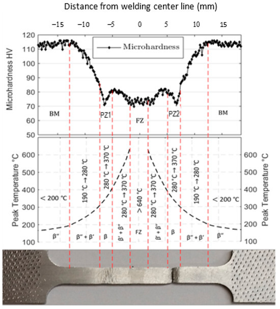 Figure 10 illustrates the profile of the maximal temperatures (TMAX), with microhardness results overlapping one another. By examining the relationship between the TMAX and hardness, it can be seen that the FZ, which was exposed to TMAX over 652 °C, has a low average hardness value of 73 HV, which could be attributed to a lack of precipitates, a change in chemical composition, and the porosity present in this zone. As observed in Figure 10, three HAZs can be distinguished, namely, HAZ1, HAZ2, and HAZ3. The zone HAZ1 adjacent to the FZ was subjected to peak temperatures between 380 °C and 560 °C and has an average hardness value of 80 HV. Here, the precipitates of β″ dissolved or transformed to β′ (with respect to the distance from the FZ boundary), and the material became a combination of α + β′ phases, as explained in [34,35,36]. The natural aging in this zone increased the hardness to 80 HV. The plane separating HAZ1 from HAZ2 was subjected to a critical temperature ranging from 290 °C to 380 °C. It had the highest β′ phase fraction because the critical temperature led to the dissolution of needle-shaped fine precipitates of β″, and the biggest one started to grow and form a rod shape β′, as presented in [34,35,36]. This plane had the lowest hardness value of 70 HV. Zone HAZ3 was exposed to a peak temperature ranging from 290 °C down to 190 °C, and its hardness value gradually increased to match that of the base metal. At less than 190 °C, the material was not affected by the welding thermal cycle.