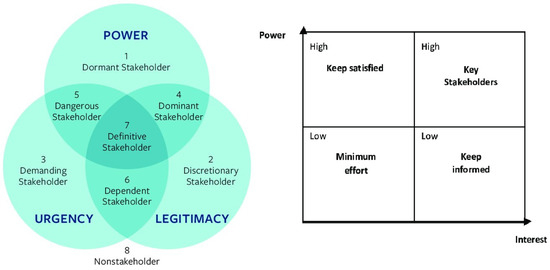 To predict all the consequences for a large number of players, a correct stakeholder management procedure is necessary. In fact, as suggested in [20], the results obtained from a study that analysed 400 strategic decisions showed that half of the decisions failed (which means they were not implemented, were partially executed, or had unsatisfactory results) in large part because decision makers failed to consider key stakeholders’ interests and information. As indicated in [21], the first step of this process consists in identifying the stakeholders involved, which means taking into account all the potential parties interested in the project. To achieve this, it is crucial to conduct an analysis of the manufacturing process that the GI will modify. This task is often not as simple as it appears [22]: at the beginning of the work, the implications in the background are far from clear, and sometimes only time can help to fully understand the scenario. The result of this task is a complete list of all the stakeholders, which is the basis for carrying out the next phase, the stakeholder classification. According to [21], this phase is important to understand the sensations, beliefs, and expectations of the stakeholders in order to correctly engage them, which is fundamental to achieving a successful outcome. First of all, it is important to analyse the position and role of each stakeholder, evaluating factors such as power, impact, influence, and interest. On the basis of this, it is possible to prioritise the involvement of each stakeholder [23] using the management instruments available in the literature, such as the Power/grid matrix [24] or the Salience model [25] (Figure 1).