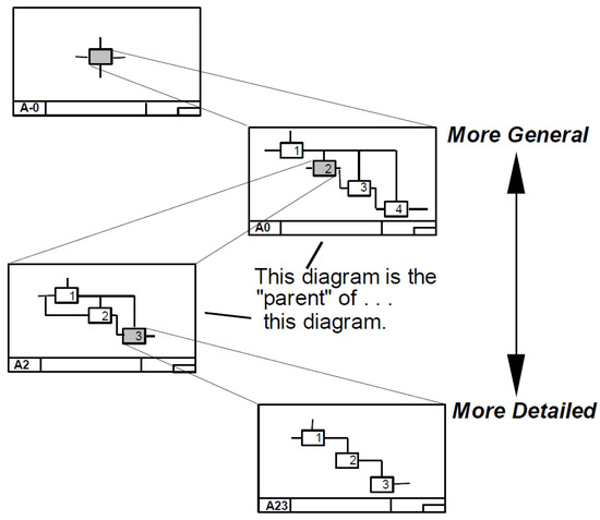 Once the main tasks have been identified and declared, it is necessary to analyse all the sub-tasks that compose each step of the process. This is a very important phase that can directly influence the result; even a small detail, if overlooked, can compromise the outcome, so it is clear that a correct analysis has to be carried out to avoid risks. For this purpose, instruments such as IDEF, which is a family of modelling languages, can be very helpful in creating an explanatory graph of the process that allows the visualisation of all the sub-tasks and their inputs, outputs, controls and mechanisms. IDEF0 is a functional enterprise modelling tool that was developed in the late 1970s through the US Air Force’s Integrated Computer Aided Manufacturing (ICAM) program. IDEF stands for ICAM Definition. IDEF0 is used to represent the functional (i.e., activity- or process-oriented) framework of a system [32]. The IDEF0 is a process modelling technique and industrial standard as well, with extended literature references in the analysis and design of projects in the fields of manufacturing, aerospace, business, and information systems science and technology [33]. The work presented in [34] provides a complete description of how the IDEF0 model works. The IDEFO models are made up of a hierarchy of connected diagrams. Each diagram is built around a diagonal row of boxes (often three to six boxes per diagram) that are linked together by arrows.