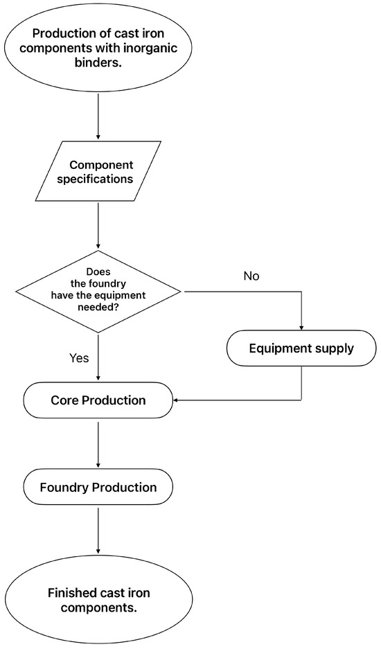 The main activities present in the manufacturing process that was carried out for Test B are common to all green sand casting production. In Figure 5, a flowchart is reported, containing the essential steps that provide a high-level representation of the process.
