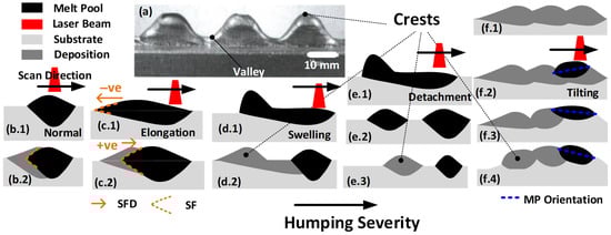 During swelling mode, the continuous formation of these crests deteriorates the printed part’s geometrical accuracy rendering it wavy (Figure 1(f.1)). When the surface is wavy, late humping symptoms (i.e., tilting mode) are observable. The MP follows a distorted path (i.e., wavy trajectory); thus, it starts to tilt—see the change in the MP orientation indicated by the blue line in Figure 1(f.2–f.4).