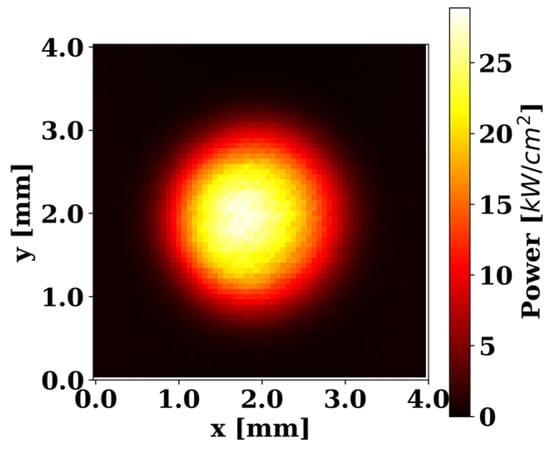 Experiments were conducted on a 3kW TRUMPF TruDiode laser (TRUMPF, Ditzingen, Germany) integrated with a six-axis CNC gantry. This system incorporated Reis Lasertec optics (Reis Lasertec, Würselen, Germany), an ILT powder nozzle (Fraunhofer Institute of Laser Technology ILT, Aachen, Germany), and a Sulzer-Metco TWIN-10 feeder (Sulzer Management Ltd, Winterthur, Switzerland). A 125 mm collimation lens, a 150 mm focal lens, a 600 µm fiber, a laser whose wavelength is 950 nm, and a spot size of D = 2.6 mm were used. Figure 2 shows the laser profile used. In this study, austenitic nickel–chromium stainless steel powder was used; it has a nominal particle size distribution between −45 and +11 µm and a chemical composition of Fe 17Cr 12Ni 2.5Mo 2.3Si 0.03C. Circular builds of 25 mm in both height and diameter were constructed under varied printing conditions, as detailed in Table 1. Three parts were printed using combinations of two laser powers, P, and two traverse speeds, v. All prints were made with an 8 g/min powder flow rate. In total, nine parts were printed, including two replicas. We focus on thin-walled (i.e., single-bead multi-layer) prints as they are the most prone to humping defects. A continuous spiral printing path was generated by rotating the table and moving the head in the positive Z direction, as shown in Figure 3.