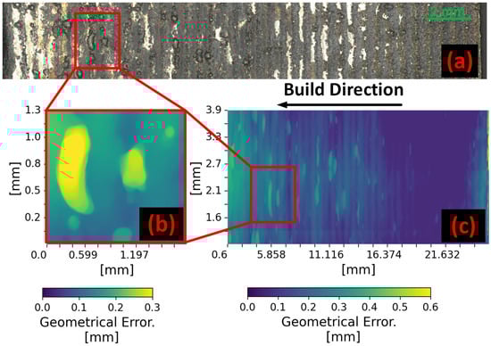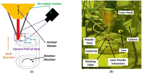 For melt pool monitoring, a med-wave infrared MWIR camera (i.e., FLIR SC8300 (FLIR Systems, Inc., Wilsonville, OR, USA)) was used. The MWIR option was selected to ensure the capture of low-temperature regions, such as the melt pool tail, which cannot be captured by a normal VIS camera (i.e., a camera only sensitive to visible light). This is because visible light is mainly emitted by objects at extremely high temperatures [26]. The camera was equipped with a 50 mm focal lens with a 1-inch extension tube to achieve the desired field of view (FOV) of 5 mm × 3.5 mm. The camera was operated at a frame rate of 233 Hz and a resolution of 256 × 180 pixels. These settings were selected so that the sampling frequency was adequate to capture the humping dynamics. To allow for continuous monitoring and to negate any relative movement between the melt pool and the camera, the camera was directly mounted on the laser head, as shown in Figure 3b. After printing, the as-printed parts were imaged using a ZEISS Smartzoom 5 (ZEISS, Oberkochen, Germany) automated digital microscope to qualitatively assess the geometrical accuracy (i.e., topography).