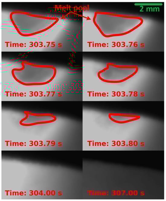 The present study collects the melt pool infrared signature as a series of 2D images throughout the printing duration. These sequential images provide a comprehensive overview of the melt pool spatiotemporal variations. Figure 4 shows a single frame; the top part shows the large field of view (the top image shows a zoomed-out FOV, not the processed FOV in the developed approach) of the entire cylinder, while the bottom part zooms in on the heat-affected zone (HAZ) and the melt pool. It should be noted that despite its higher temperature, the melt pool in Figure 4, marked in red, exhibits a darker appearance, indicative of lower pixel intensity. This phenomenon can be explained by the variations in emissivity associated with different phases of the material, which affect its heat radiation. According to the Stefan–Boltzmann law, the total radiation (Prad) emitted by a body is a function of both its temperature (Temp) and its emissivity (ϵ), expressed as Prad = σϵATemp4, where σ represents the Stefan–Boltzmann constant. In the case of stainless steel, the liquid phase exhibits a lower emissivity compared to its solid counterpart [27], especially when the solid is oxidized [28]. Consequently, the darker appearance of the melt pool in Figure 4 suggests that the decreased emissivity in the liquid state has a more pronounced effect than the increased temperature. Such an observation can be confirmed by analyzing the sequence of the melt pool’s image after the deactivation of the laser, as shown in Figure 5. During such a sequence of images, the melt pool is solidifying; thus, its temperature consistently declines. Notably, in Figure 5, the pixel intensity of the melt pool initially increases, reaching its peak around time t = 304 s, followed by a reduction at t = 307 s. This temporary increase in pixel intensity during the solidification can be attributed solely to changes in emissivity as the material transitions from liquid to solid phases. Consequently, this explains that the lower pixel intensity of the melt pool is due to its lower emissivity. This pattern aligns with observations reported in [29], where steel displayed similar radiative characteristics during solidification in an argon environment.