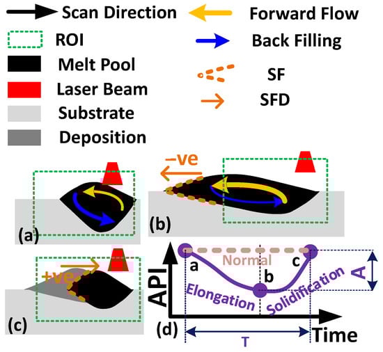 where and are the width and height of the ROI, respectively. represents the pixel intensity at coordinates in the IR-captured video frame. According to Section 3.1, is higher for the solidified stainless-steel powder used in this study. Consequently, API is higher when the solid phase dominates the ROI composition. For example, Figure 6 shows the API variations during the accumulation and solidification through one elongation mode cycle. In Figure 6a, when the melt pool is small, the ROI composition is dominated by the solid phase; thus, API is high, as shown in Figure 6d. Driven by limited backfilling and dominant forward flow, as illustrated in Figure 6b, liquid accumulates within the melt pool tail, and the SFD switches to the negative direction, denoting the onset of the elongation mode. This elongation mode shifts the ROI composition towards the liquid phase, reducing the API, as Figure 2d illustrates. This API drop is due to the liquid’s lower . Upon reaching maximal extension, the MP undergoes rapid cooling, reversing the SFD, and leading to a localized solidification in the tail, as shown in Figure 6c. This solidification dominates the ROI and increases the , thus increasing the API. Such an accumulation–solidification cycle, summarized in Table 2, will repeat throughout the elongation mode, fluctuating SFD between positive and negative values. Such fluctuations are reflected on the API, leading to the cycle shown in Figure 6c. The cycle amplitude (A) and period (T) depend on the humping intensity; small T and large A indicate intense humping. In contrast, during the normal mode (i.e., no humping), as shown by the horizontal straight line in Figure 6d, the API remains unchanged (i.e., T → ∞, A → 0) as SFD remains at zero. The subsequent steps to calculate the VIMPS indicator are essential signal-processing steps designed to minimize noise, enhance robustness, and streamline decision-making processes.