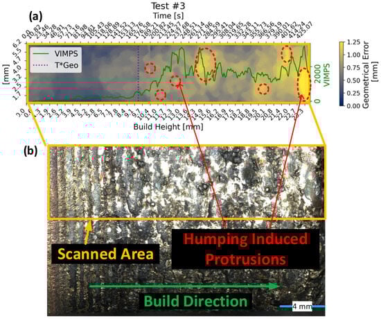 To demonstrate the correlation between VIMPS and the humping-induced geometric inaccuracy, Figure 9 shows the VIMPS overlayed on a sectioned surface topography of Test #3. The surface topography further highlights the existence and location of protrusions induced by humping, as shown earlier in Figure 7c. In Figure 9a, these protrusions appear as yellow bright spots. Such spots result from the sudden and localized solidification highlighted earlier in Figure 1 during swelling modes. More importantly, when VIMPS is overlayed on the topography in Figure 9a, the noticeable increase in VIMPS matches the building height at which the protrusion starts to appear more frequently (i.e., protrusion density). Note that in Figure 9a, the x-axis (i.e., location) is shared but not the y-axis. This alignment between VIMPS and the density of the protrusions further confirms the utility of VIMPS for both humping detection and quantification.