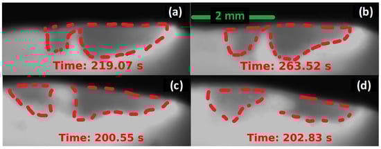 Manually annotated melt pool at the detachment mode (a,b) from Test #1 and (c,d) from Test #3. (a,c) First instances of the detachment mode in the corresponding test and (b,d) the second instance.