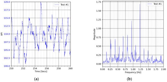 (a) Average pixel intensity (API) during tilting in Test #1 (i.e., layer-32 to layer-44) and (b) its fast Fourier transformation analysis.