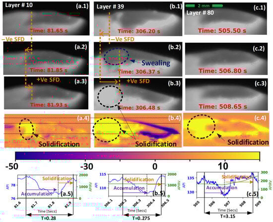 Figure 13(c.5) also shows interesting insights correlating Test #2’s overall relatively good geometrical accuracy with its solidification dynamics. For Test #2 in Figure 13(c.5), the elongation cycle time (T) is significantly higher than the other two tests in Figure 13(a.5,b.5). Test #2 takes 3.15 s to complete one cycle, while it took 0.28 s for the other two tests. This indicates that the elongation mode is activated in both, especially toward the end layers, but with a longer cycle time in the case of Test #2.