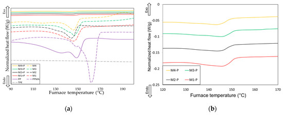 where represents the fusion enthalpy (derived from the integral of the endothermic peak on the DSC curve), is the enthalpy of fully crystalized PP (207 J/g) [40], and is the weight fraction of PP in the analyzed sample.
