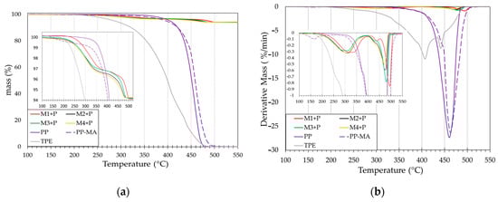 The degradation profiles of the raw materials, as shown in the TGA analysis presented in Figure 2a, reveal distinct rates and temperatures of thermal decomposition. PP-MA exhibits an onset of degradation at lower temperatures compared to PP, likely attributable to the incorporation of maleic anhydride. Notably, the thermal decomposition residuals at 700 °C for PP and PP-MA are 0.029% and 0.190%, respectively. This disparity suggests that feedstocks with a higher proportion of PP-MA could have a pronounced impact on the carbon content in the final printed samples due to incomplete combustion. Moreover, the M1-P sample, enriched with PP-MA, demonstrates a higher thermal degradation onset than other feedstocks. This observation may indicate a stronger interaction between the polar maleic anhydride component and the surfaces of the powders, as the proportion of the grafted backbone increases. Such interactions indicate enhanced thermal stability, which could benefit the performance of printed materials under elevated temperatures.
