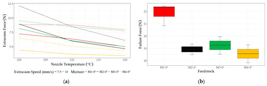 The mean extrusion force for the four different feedstocks as a function of extrusion speed and nozzle temperature is illustrated in Figure 3a. The analysis demonstrates that extrusion speed significantly impacts the extrusion force across all tested conditions. Despite the anticipated increase in shear rate with higher extrusion speeds, the 7.5 mm/s speed resulted in a lower extrusion force for all feedstocks and temperatures tested. Notably, the M4-P feedstock displayed the lowest extrusion force, suggesting it had the lowest viscosity among all samples. This finding is consistent with literature on non-grafted PP, which posits that the absence of grafting agents, such as maleic anhydride, might lead to decreased material viscosity, easing the extrusion process [44].