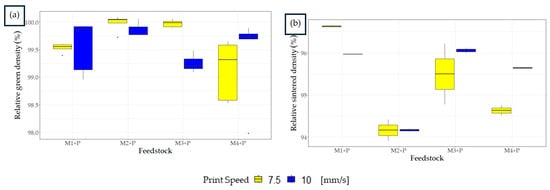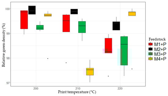 The PP/PP-MA ratio significantly influences relative density and its temperature-dependent variability. The relative green densities of the printed samples, presented in Figure 4, show that while M4-P samples faced significant green density fluctuations due to their high PP/PP-MA and TPE content, M2-P, with a lower PP/PP-MA ratio, showed better performance and stability. This difference is attributed to the M2-P feedstock’s improved powder and polymer matrix compatibility, minimizing issues like material dragging and nozzle sticking, hence ensuring more accurate material deposition and print line solidification. The variability in the M4-P feedstock is a result of reduced interactions between the powder surfaces and the polymer matrix, causing material dragging, inaccurate placement, solidification of print lines, and a material’s propensity to stick in the nozzle, leading to material accumulation on the sides of the printed samples.