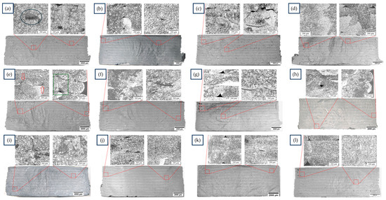 SEM-BSE details of some defects and optical microscopy of the green samples after cryogenic fracture of different feedstocks: (a–d) M1-P, M2-P, M3-P, M4-P respectively, at 220 °C and 10 mm/s; (e–h) M1-P, M2-P, M3-P, M4-P respectively, printed at 200 °C and 10 mm/s; (i–l) M1-P, M2-P, M3-P, M4-P respectively, printed at 200 °C and 7.5 mm/s.