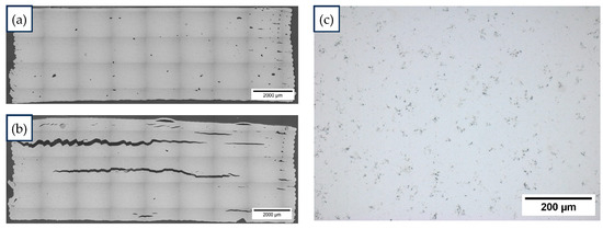 Metallographic images of representative results of the sintered samples: (a) printed with the M1-P feedstock at 200 °C and 10 mm/s, (b) printed with the M2-P feedstock at 200 °C and 10 mm/s, (c) 200× micrograph showing carbon precipitation and micropores found in all the samples. The 200× micrographs of the other samples printed at 200 °C can be found in the Supplementary Material.