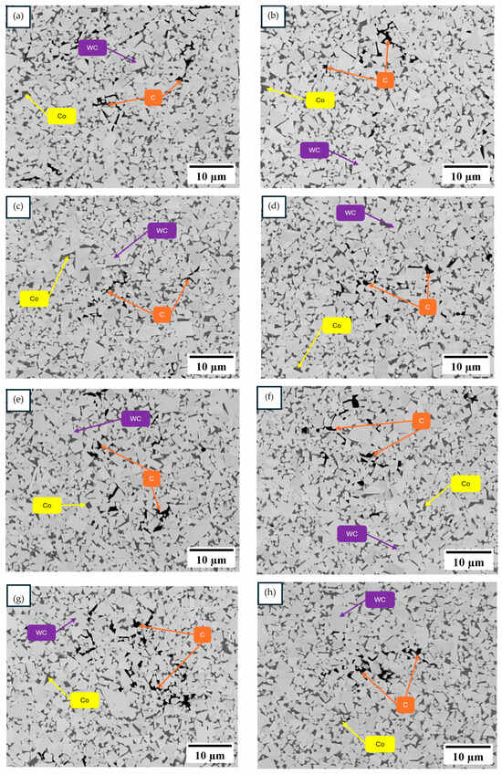 Optical microscopy of the polished samples reveals carbon precipitation mixed with some porosity clearly visible at 200×. According to ASTM B276-21 [50], the observed porosities for the M1 + P samples are classified as A02-B00-C06, while the remaining samples are classified as A02-B00-C04. This apparent increase in the residual carbon in the M1 + P feedstock (Figure 7c) can be attributed to the higher residual carbon found in the TGA for the PP-MA. The SEM micrographs of the sintered samples printed at 200 °C are depicted in Figure 8. All microstructures exhibit zones of carbon precipitation in the Co matrix, likely resulting from excess carbon originating from the degradation of the polymeric chains in the backbone, which reduces the measured density of the sintered samples. To address this issue, a reductive atmosphere in thermal debinding will be required to remove this excess carbon [32].