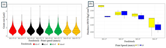 Developed feedstocks after printing at 200 °C and sintering at 1500 °C: (a) Violin plot of grain size from data obtained with digital image processing; (b) Vickers hardness.