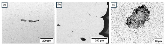 A two-way ANOVA (Table 6) on hardness response highlighted the significant impact of printing speed, unlike green density, underscoring the critical balance between layer adhesion and defect avoidance for successful debinding and sintering of the parts. Printing defects observed in Figure 10a–c are examples of how defects formed during the printing stage persist post-sintering, with a notable rounding effect primarily due to the capillary forces of liquid cobalt. This phenomenon causes defects with a low form factor, like those shown in Figure 10a, to increase in height, negatively impacting the density of the sintered material and, consequently, its mechanical properties. This phenomenon suggests that cracks or defects formed during the solvent or thermal debinding process could worsen during sintering due to capillary force deformation.