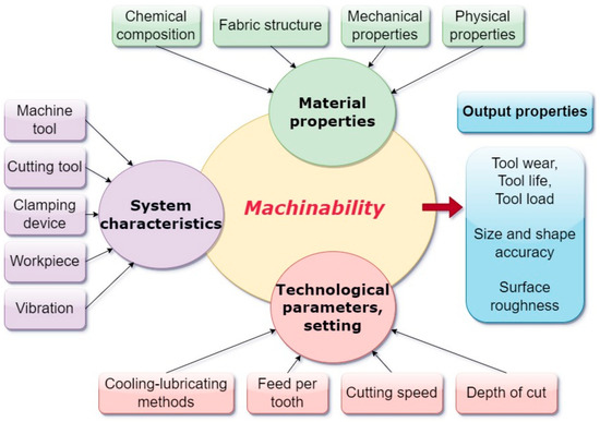 Machinability is influenced by several factors such as material properties, system characteristics, and various cutting parameters and settings, as shown in Figure 1. These factors act as a system to influence tool wear, tool life and load, size and shape accuracy, and surface roughness of the machined surface [16,19,20,21]. Of these factors, the effects of cooling–lubricating processes will now be addressed.