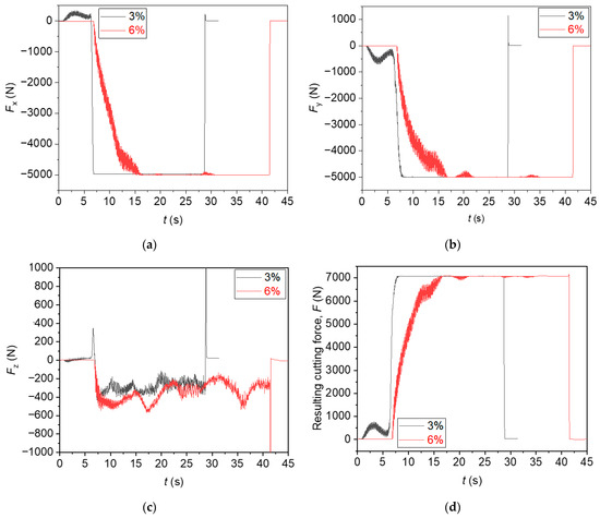 The evolution of the cutting force components and the calculated cutting force as a function of the machining time for an axial depth of cut of 8 mm are shown in Figure 3. It can be seen that at the 3% oil concentration, the x and y directions of the cutting force immediately increased up to the 5000 N limit, and then broke after nearly 30 s, after a machined length of about 20 mm, as shown in Figure 4. At 6% oil concentration, the force rise was less steep than at 3%, but the load reached the measurement limit and broke at 42 s, which represents a machined length of 26 mm. Tool failure occurred in both oil concentration cases, starting with the chipping of the corners; then, the edges chipped, and finally, the tool body fractured. This can be attributed to insufficient lubrication, which failed to compensate for the friction generated on the contact surface of the tool and workpiece due to the large depth of cut, leading to heat buildup that softened the tool edge and initiated premature tool failure. As the tool broke at both oil concentrations, the axial depth of cut was reduced to 4 mm.