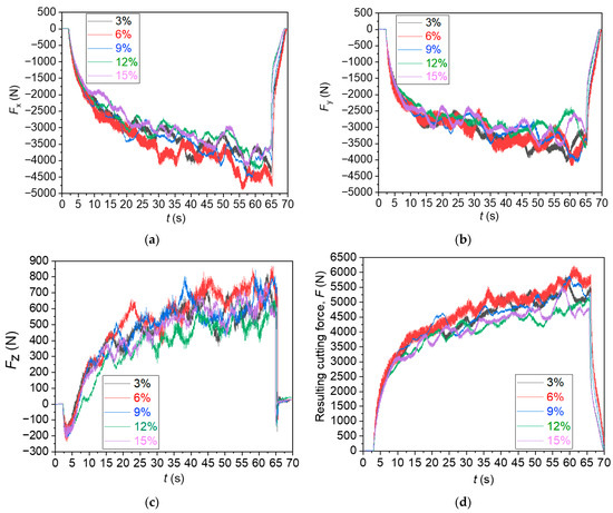 (a) Fx; (b) Fy; (c) Fz; and (d) F resulting cutting force as a function of machining time for an axial depth of cut of 8 mm.
