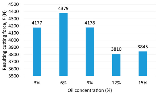 The evolution of the cutting force components and the calculated cutting force as a function of the machining time for an axial depth of cut of 4 mm are shown in Figure 5 and Figure 6. From the results, it can be seen that the highest cutting force was obtained at an oil concentration of 6%, and the highest vibrations were also obtained in this case, which can also be seen in the tool wear results in Figure 7 and Figure 8. The lowest cutting force occurred at an oil concentration of 12% and increased again at 15%, suggesting that the optimum oil concentration is 12%. This is because too high an oil concentration causes an oil coating to build up on the cutting edge, which increases the cutting-edge radius, as after a coating process. These results suggest that it is better to use a higher oil concentration, as the lubricating effect of the emulsion has a greater influence on the cutting force. However, an oil concentration of 6% is to be avoided, which is interesting because the industry does not go above this level to reduce costs.